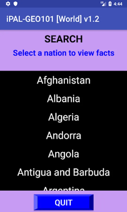 SEARCH - This feature allows you to examine the facts of countries without playing any games. Just select a country from the list and review its facts on the screen.
