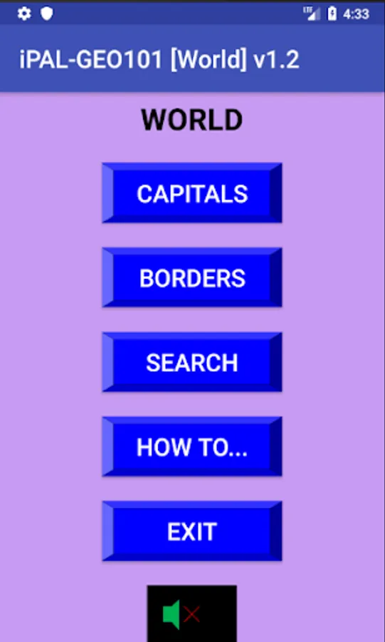 There are two games in this application - CAPITALS and BORDERS - and a SEARCH selection to quickly access facts about any country.