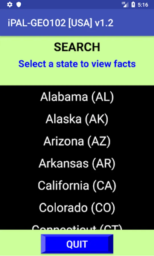 SEARCH - This feature allows you to examine the facts of states without playing any games. Just select a state from the list and review its facts on the screen.