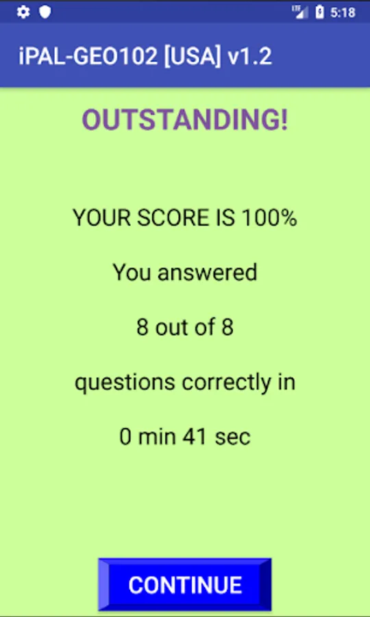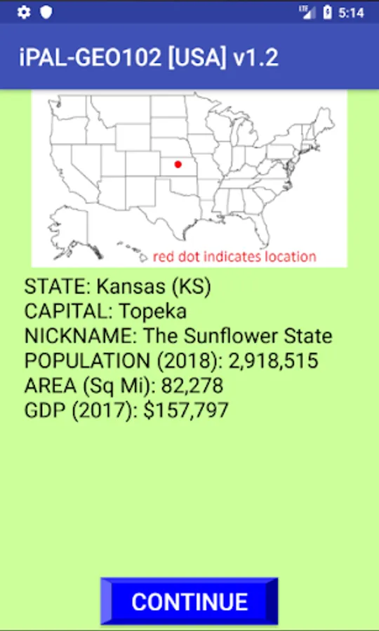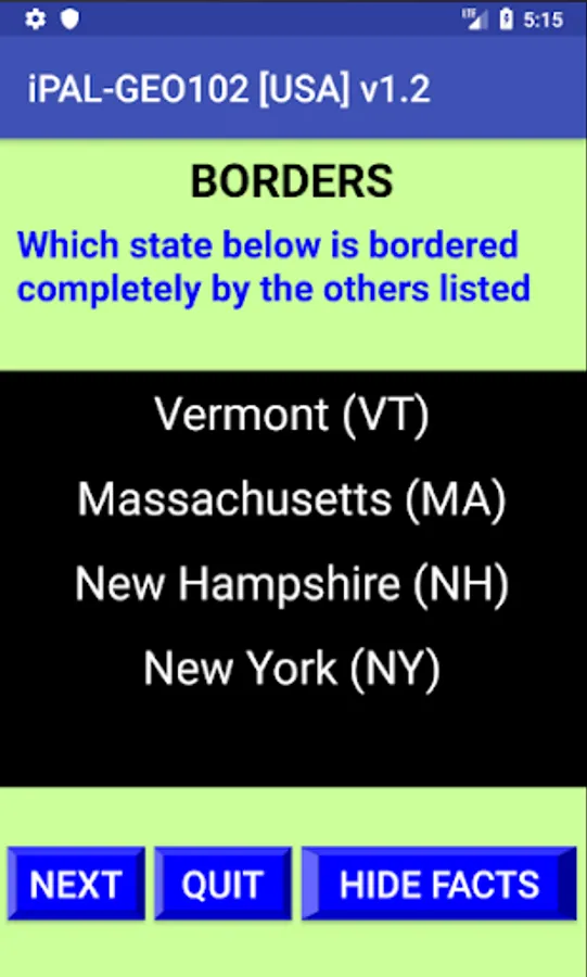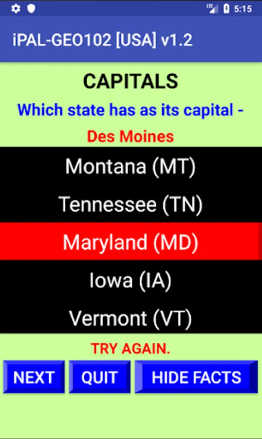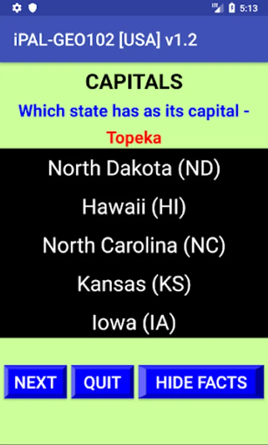 Once you select the correct answer from the list, pertinent facts about the state will be displayed; you have the option to bypass this feature.
