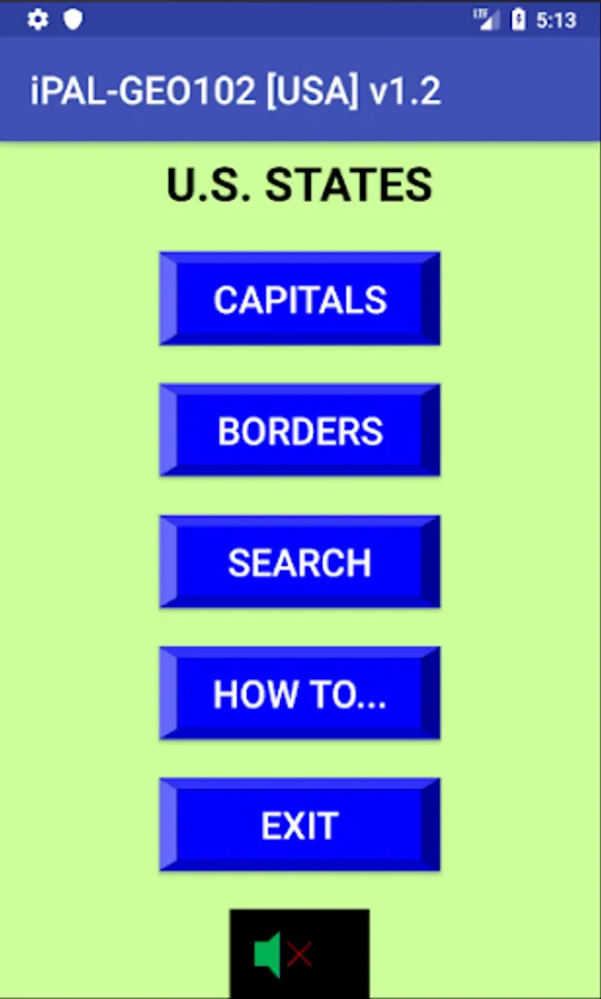 There are two games in this application - CAPITALS and BORDERS - and a SEARCH selection to quickly access facts about any state.