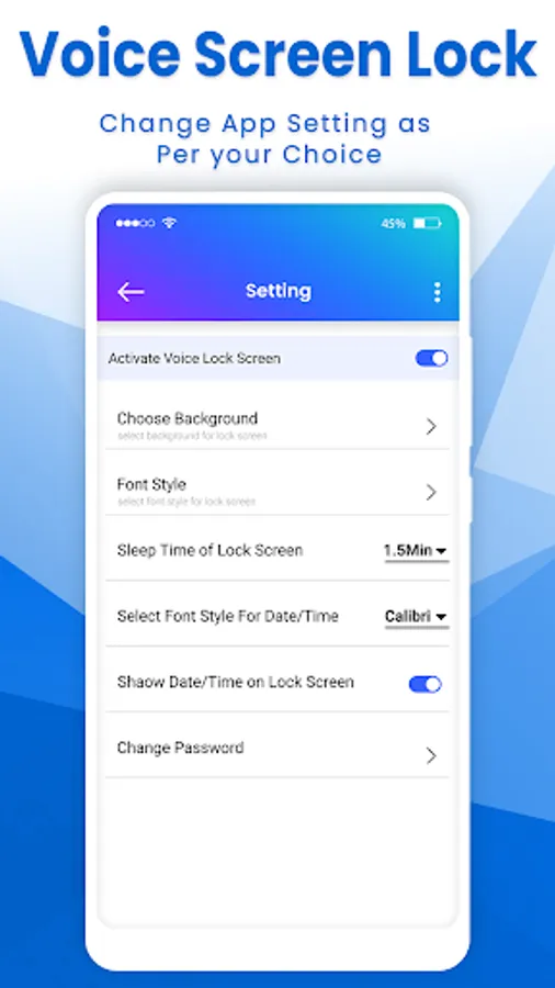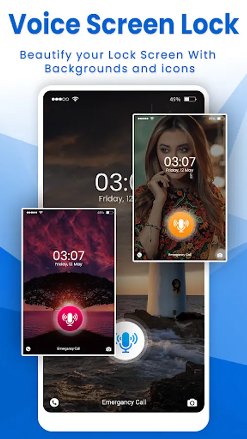 Beautiful and customizable Voice lock screen for any android device. Set a voice password and use it to unlock your device. Use different lock screen with different pattern through secure your data or private or sensitive data. You wants totally different lock screen also this work with your voice. So your wish is complete.