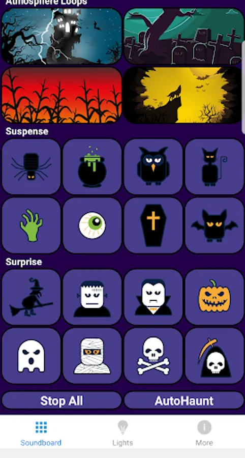 Select AutoHaunt to keep the haunt going by cycling through Atmospheres while randomly playing Suspense and Surprise events. Great for a halloween party or to spook trick-or-treaters.