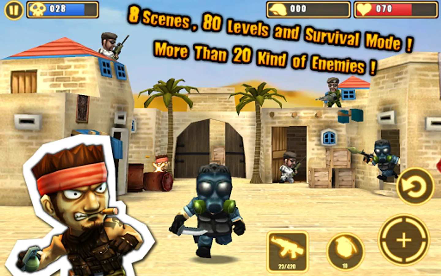 You are as a battle-hardened mercenary to fight enemies using a variety of weapons. Totally 22 weapons,grenade and 4 armors can be bought in store. To make money by completing more tasks to buy better equipments. There are 80 levels in 8 maps and 2 extra funny games. And a number of game achievements and online leaderboards, players can join with the global rivalry.