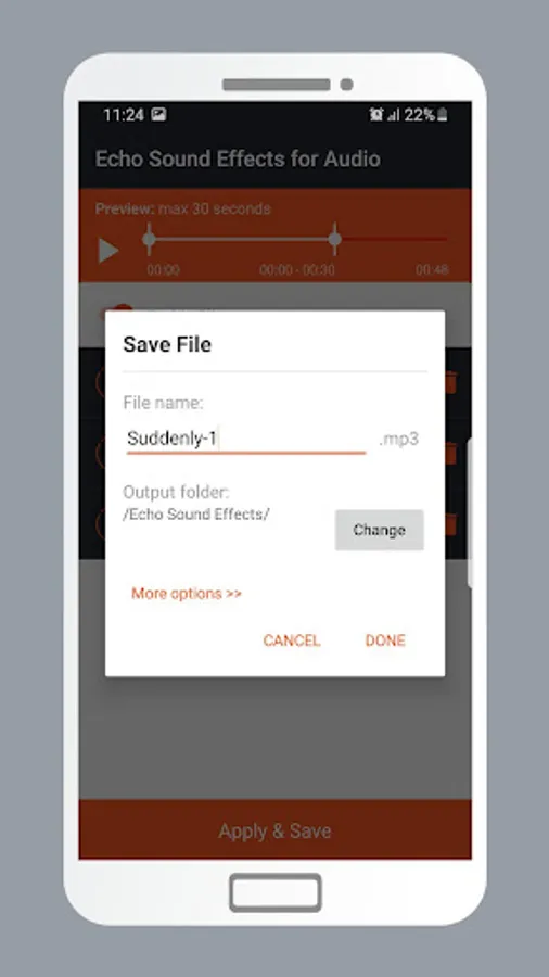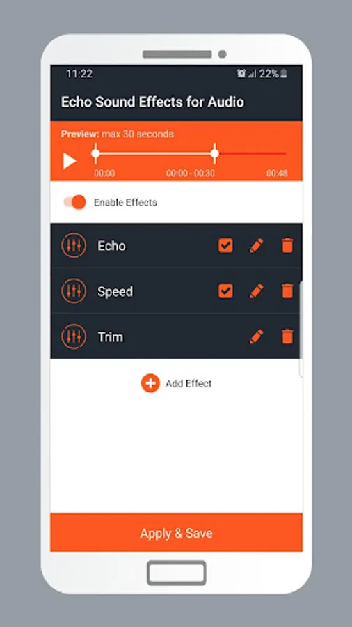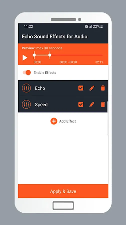 Echo Sound Effects for Audio is a smart tool apply echo effect on any audio file. In the main screen just touch the button "Select File" to get started.