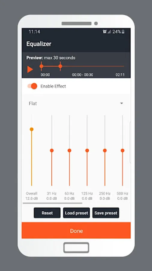 This app comes with a plenty of audio effects that can be applied to any file like Echo, Delay, Speed, Fade in/Fade out, Bass, Pitch, Treble, Chorus, Flanger, Earwax sound effect or you can our advanced Equalizer tool.