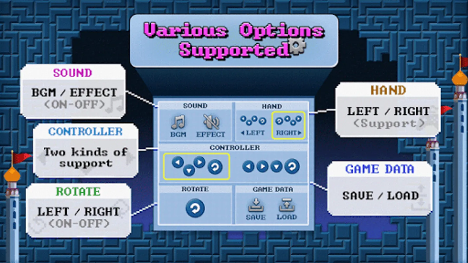 This is a classic puzzle game that anyone can easily enjoy. Various missions and various options make the game fun and convenient. There are 4 modes: Level Mode, Arcade Mode, Classic Mode, and Multi Mode. There are 14 different blocks. Collect and choose your favorite blocks.