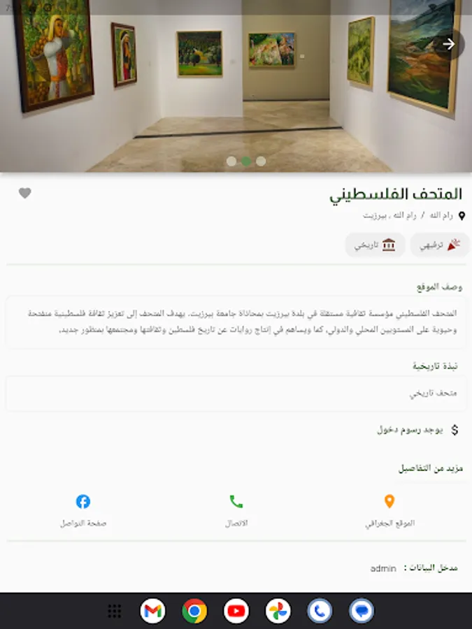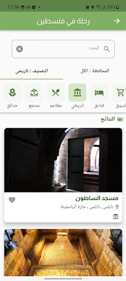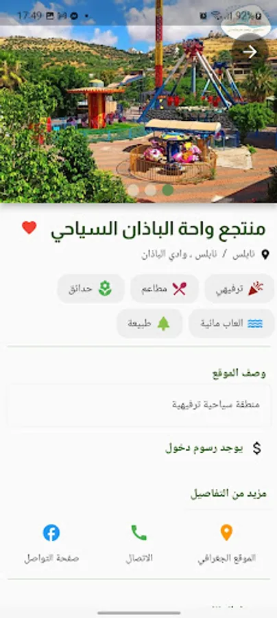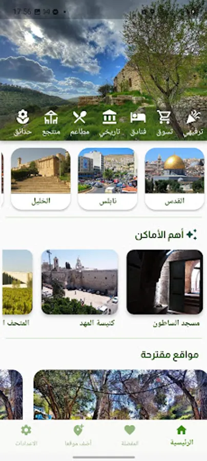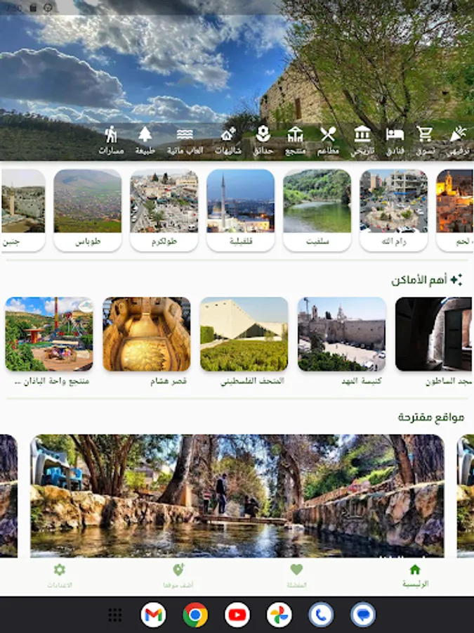 رحلة في ربوع فلسطين تطبيق يهدف الى التعريف بالاماكن والمنشات السياحية والتجارية في فلسطين .. من خلال هذا التطبيق يمكنكم التعرف على مجموعة متنوعة من المنشأت بمختلف تصنيفاتها. يشمل هذا التطبيق الأماكن السياحية والتاريخية, بالإضافة الى الأماكن الترفيهية والتجارية والفنادق ومجموعة من التصنيفات الاخرى. كما يمكنكم الحصول على مجموعة وافية من المعلومات التي تهم كل سائح عن هذه الأماكن مثل وصف المكان ,الموقع , الاتصال بالإضافة الى مجموعة من التفاصيل التي تهم السائحين , في هذه النسخة تم إضافة مناطق الضفة الغربية وسيتم لاحقا العمل على إضافة جميع مناطق الوطن. يتيح التطبيق أيضا لاصحاب المنشات والفنادق ومراكز التسوق والأماكن السياحية والترفيهية خاصية إضافة موقع جديد بهدف الى تعريف الناس بالمنشأة وطريقة الوصول اليها.