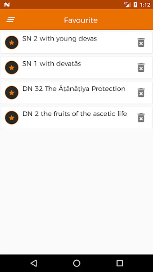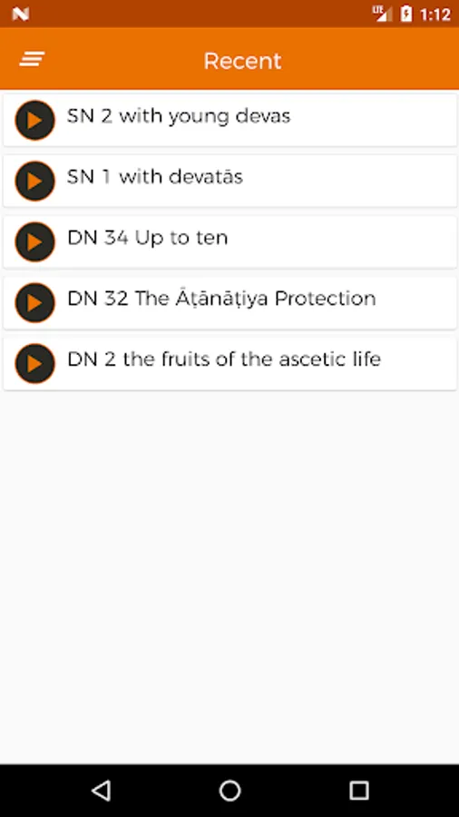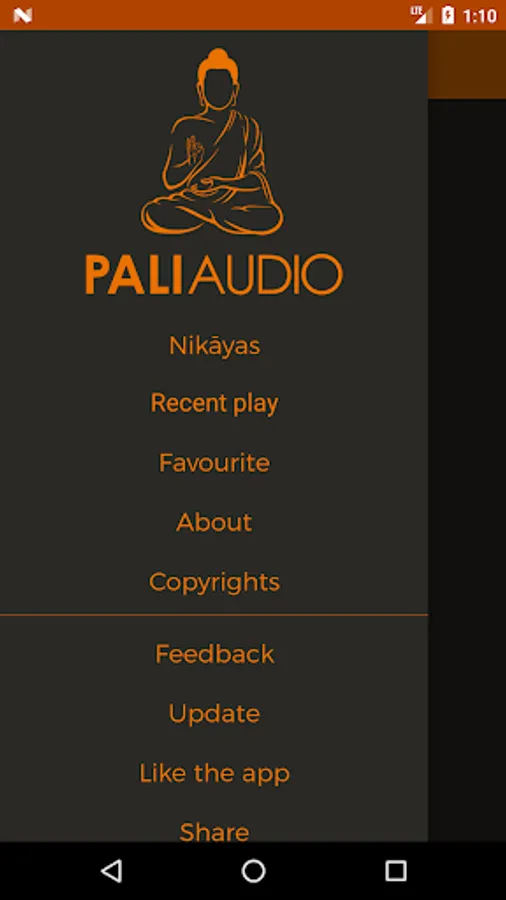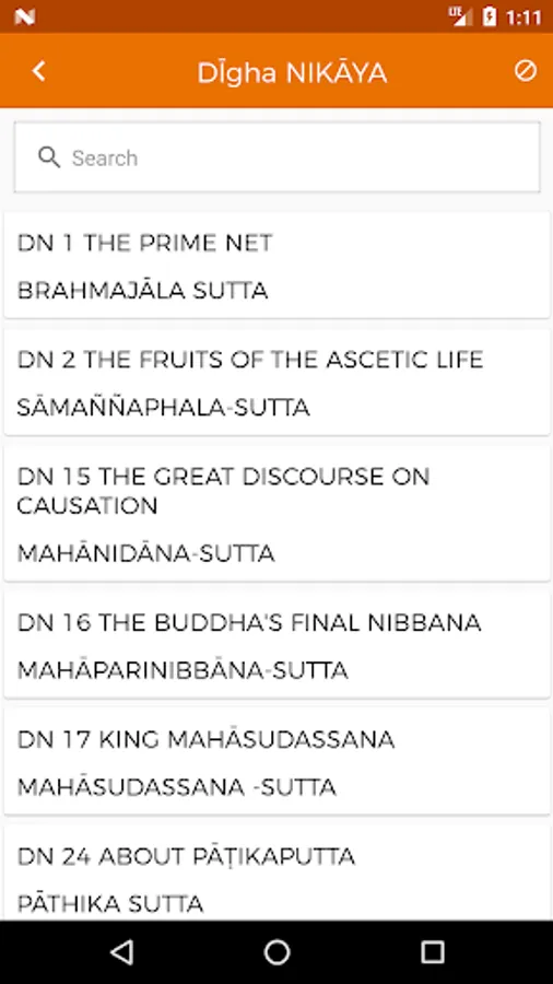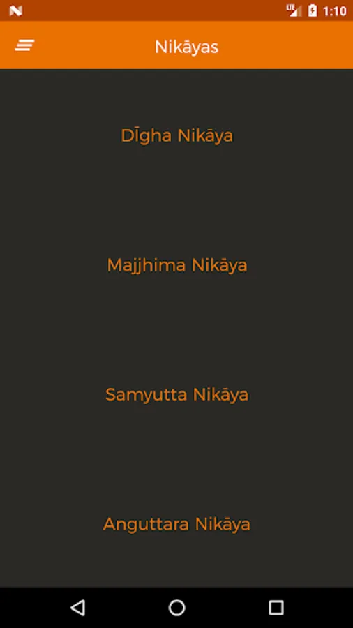 The app follows the arrangement of the Sutta-piṭaka, which consists of four primary collections (nikāyas): the Dīgha-nikāya or “collection of long sayings” comprises thirty-four suttas; the Majjhima-nikāya or “collection of middle length sayings” comprises of 152 suttas; the Saṃyutta-nikāya or “collection of grouped sayings” is arranged in fifty-six groups of suttas according to topic, the Aṅguttara-nikāya or “collection of numbered sayings” is arranged in eleven sections according to the number of items that form the main subject-matter.
