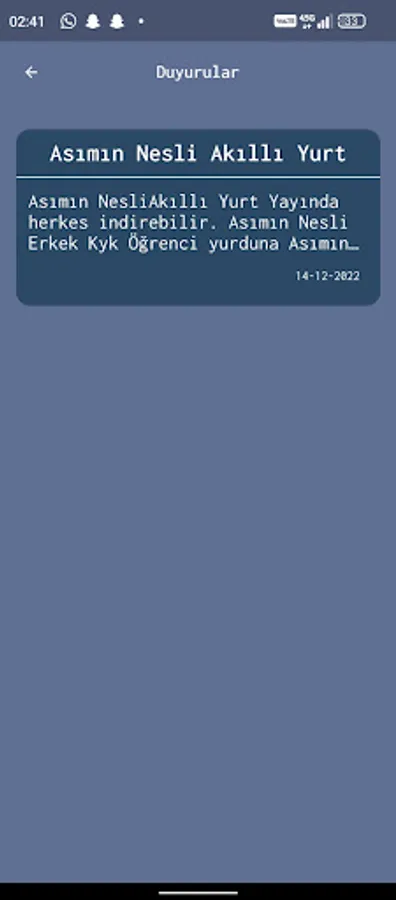 Asım Nesli KYK Men's Dormitory is a new generation smart dormitory application where you can submit your complaints within the Smart Dormitory Application, be informed about the events and follow the announcements.