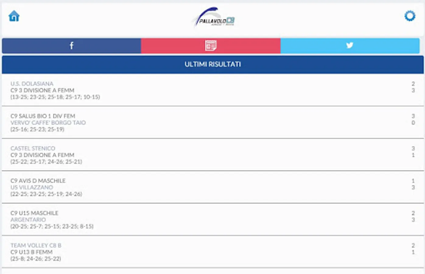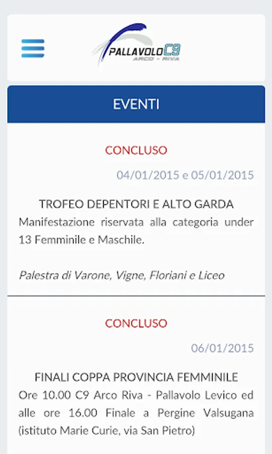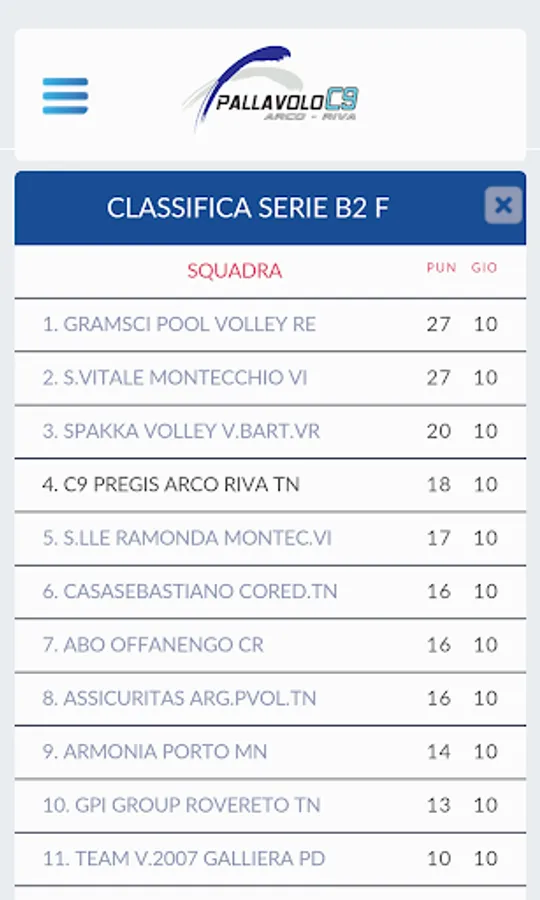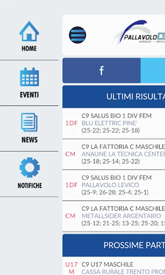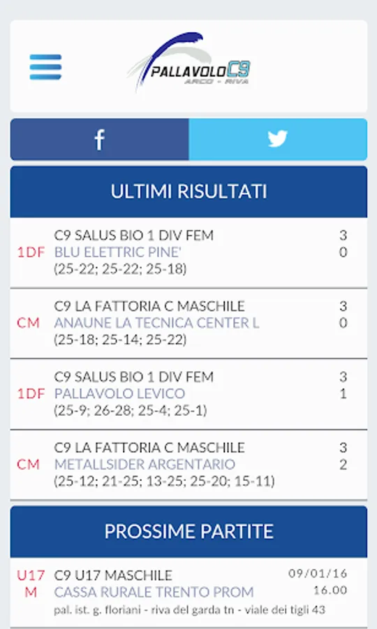 The application allows you to view the results, with charts and details of day, any formation of C9 Volleyball Arco Riva. You can get information about the upcoming championship rounds and details about the matches of all the other teams that are part of our championships.