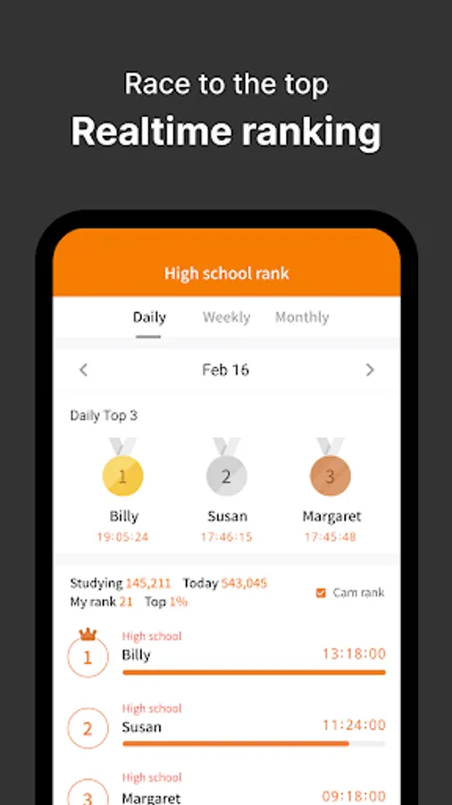Record your study time and share it with friends. Get motivated with your friends and study together remotely.