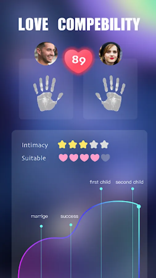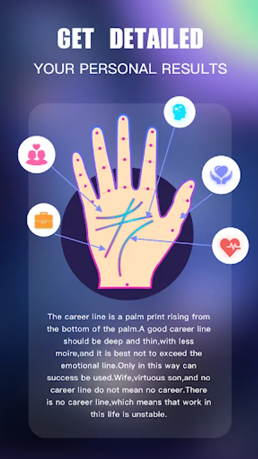 Palmistry, or palmistry, is a possible way to create love signs or health signs according to the hand line. In our app, you can get free palm reading or daily reading and receive palm reading prediction every day.