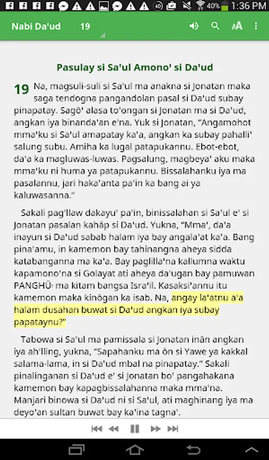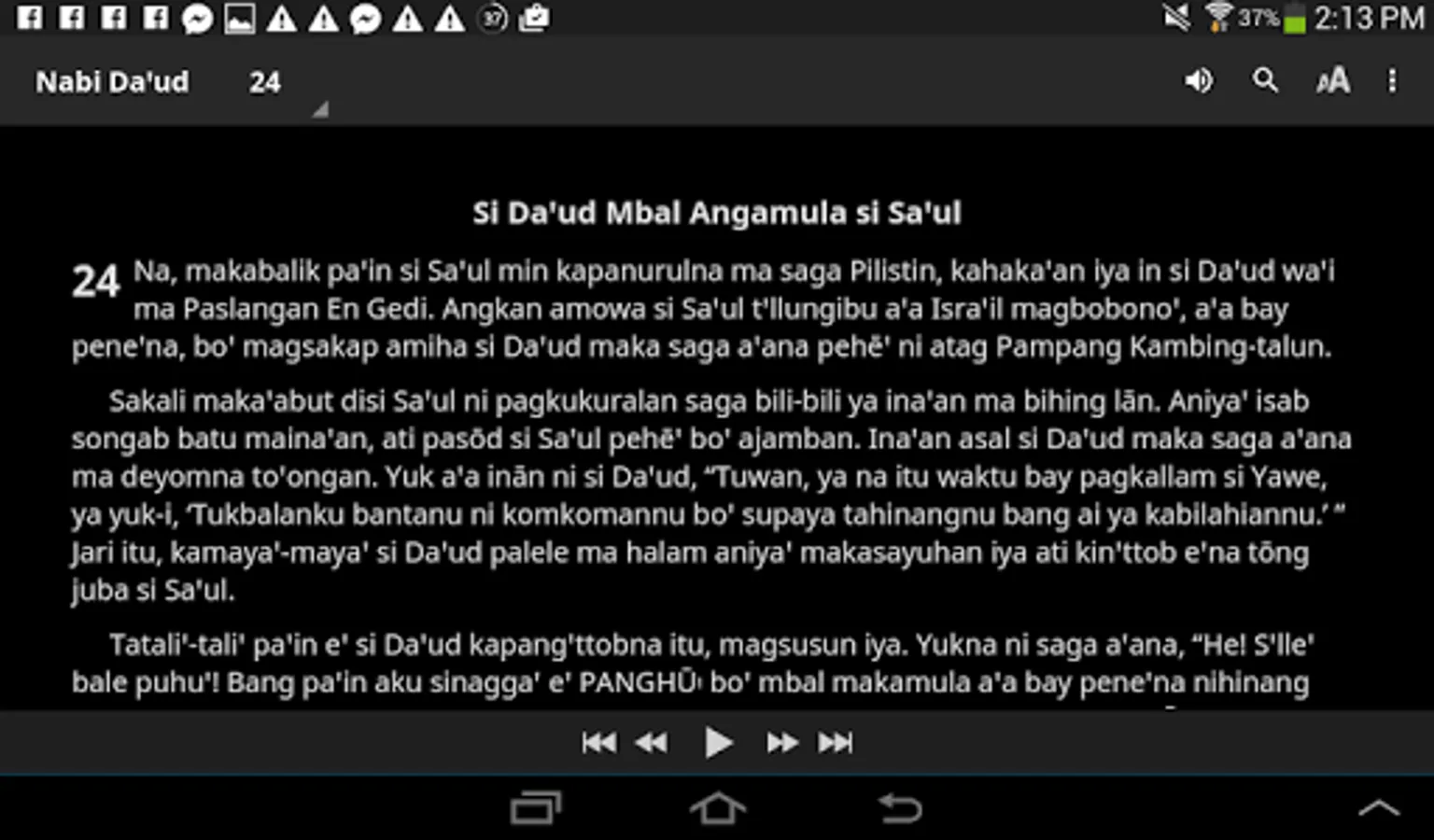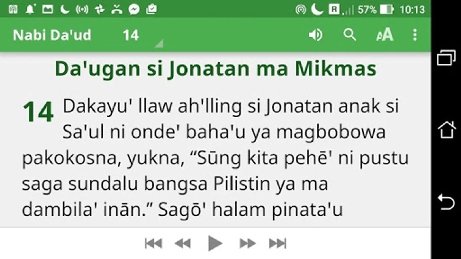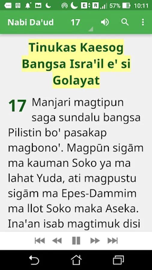More than 3 hours of the dramatized story of Nabi Da'ud starting from Tuhan choosing the child Samwel as his prophet, followed by the selection of Sultan Saul as the first king of His people, and then the sheperd Da'ud working in the service of Sultan Saul and eventually killing the giant Goliath. Eventually Sultan Saul attempts to kill Nabi Da'ud but the prophet refuses to kill the man whom God chose as king even when that king is being possessed by an evil spirit and trying to kill the prophet.