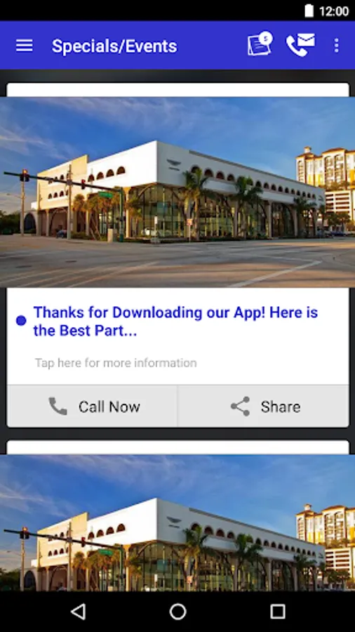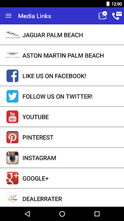 In addition, all the standard Dealership App features are here: Call/email each department, get directions, view store hours, get vehicle quotes, order parts, etc.