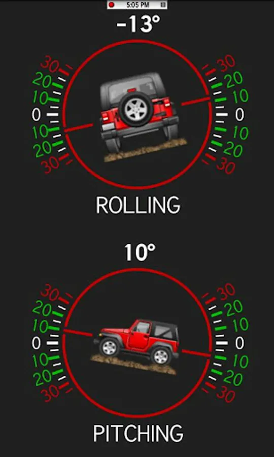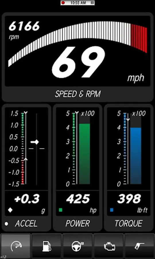 This app also features a professional skidpad showing lateral and accel/braking Gs with min/max indicators, a race track that visually maps out your location, acceleration and braking as you drive laps around the track, an inclinometer that shows rolling angle and vehicle pitch for off-roading, and the ability to data log, record and playback log files showing OBD-II and acceleration data.