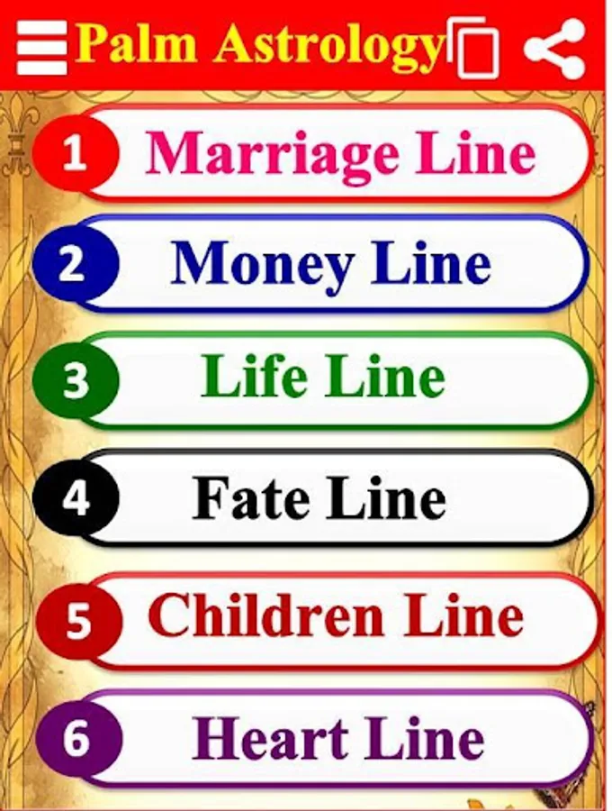 हस्तरेखा ज्ञान एप्प में आपको हथेली की रेखा जैसे भाग्य रेखा विवाह रेखा आदि के बारे में चित्र सहित विस्तार रूप से समझाया गया है. जिसकी सहायता से आप स्वयं अपने हाथ की रेखाओ को देखकर रेखाओ के बारे में ज्योतिष अनुसार बहुत कुछ समझ सकते है