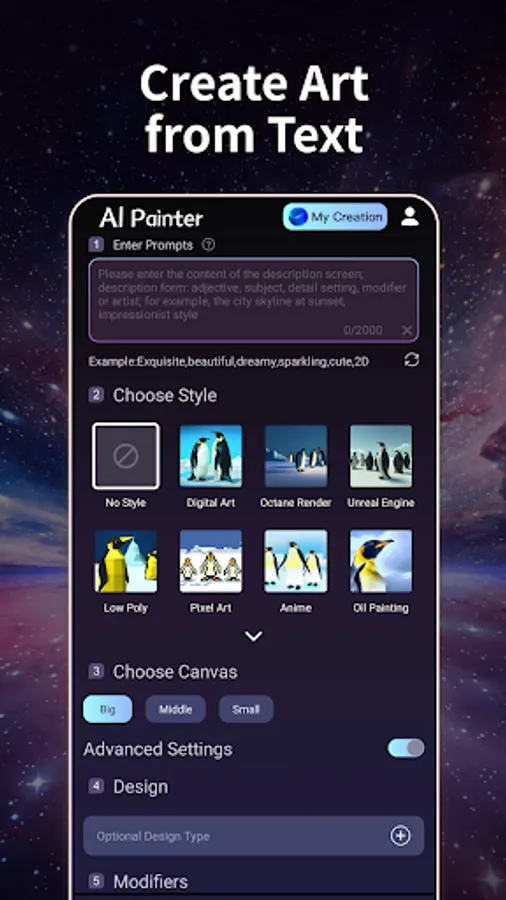 1.Use words to describe what you want to create, no matter what. Enter the words. Such as " Avatar running in the forest " " Iron Man in mechanical armor " . AI will generate AI Artworks.