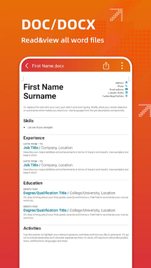 Office Documents Reader&Viewer is a smart office file reader application that helps you open office, read PDF、Word、Excel、PPT and all documents. only with your mobile, you can manage all files and read all documents in PDF, PPT, XLS, TXT or Word file format.