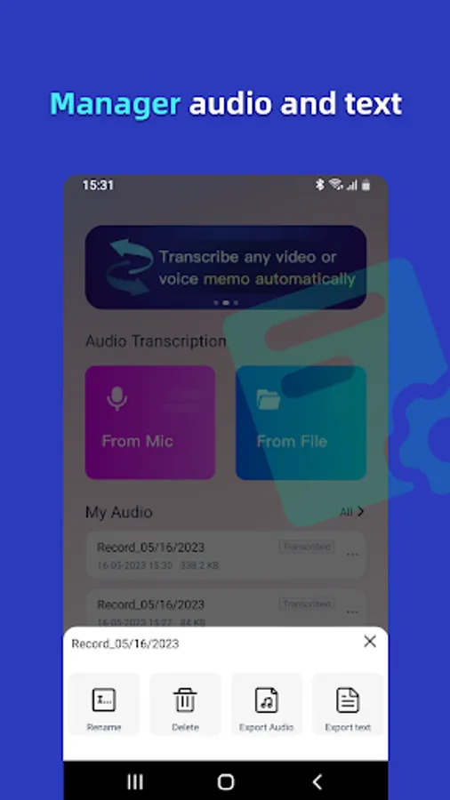 Convert voice notes to text with 'From audio file', or convert speech to text in real-time with 'From mic'. Transcribe supports all audio formats and multiple languages, and makes it easy to share your text files and audio files.