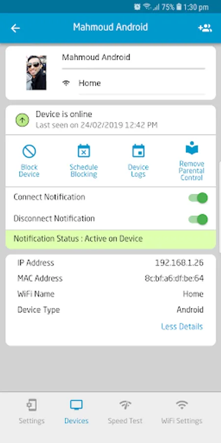 The Application also provides information and details about your device status, ID, connectivity, devices connected, LAN setting and other insights.
