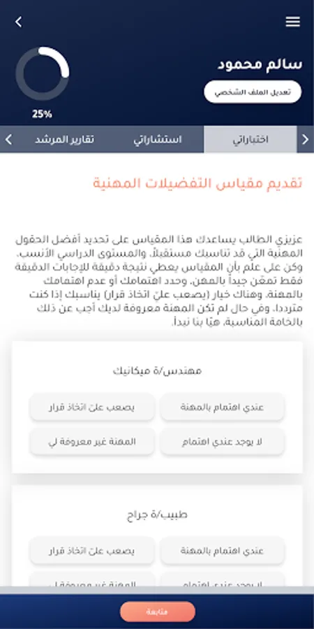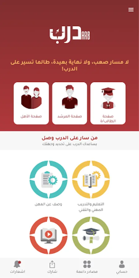Where Darb contains a set of orientation and career counseling tests distributed according to the age group of the student, as the student can enter the trail in a smooth manner, through which he / she fills his personal information, so that the trail automatically determines the number and type of professional measurement tests that suit him / her. Depending on the educational level and / or path, then students start filling out their exams on the carton, so that the trail shows the results of the tests directly on the student's page, and these results are automatically posted on a page for the mentor to provide appropriate guidance and direction based on the results of the tests.