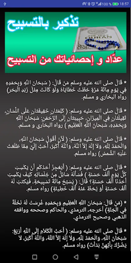 The application is an electronic rosary, and it keeps your memory away from the praise in your phone memory. It is not easy to monitor your memory and the application in your hands helps you remind you of the praise and gives you all the daily and monthly statistics and the total of your memory since you downloaded the application of the praise counter and statistics.