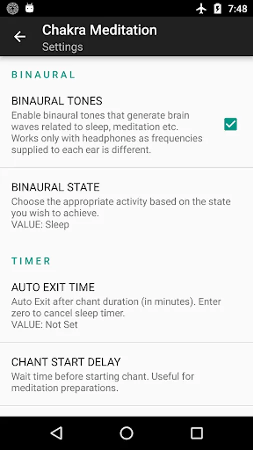 The app features Binaural Tones that are know to be highly effective in generating brain waves similar to sleep, dreams, meditation etc. Typical brain waves are of very low frequencies that are not directly audible by human ear. Binaural beats is a technique of supplying slightly differing tones to each of the ears, to cause the brain to internally generate these inaudible frequencies. It is the same technique used for inducing sleep, trance or self-hypnosis. To use this powerful feature, enable it in Settings and listen through head phones.