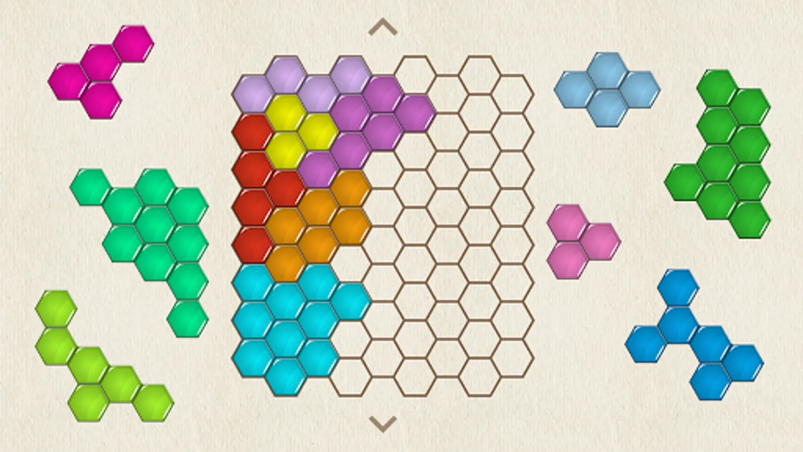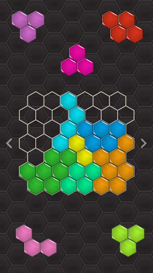 Honey bees figured out thousands of years ago that they can store maximum honey with least amount of bees wax using a grid of hexagons. What makes Hexa Puzzle interesting is the multiple interlocking possibilities that the pieces made of hexagons provide. This makes it challenging to guess the position of the pieces. But as you play through the levels, you will get better at it.