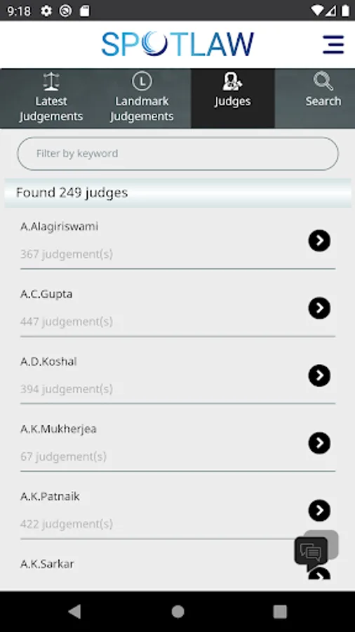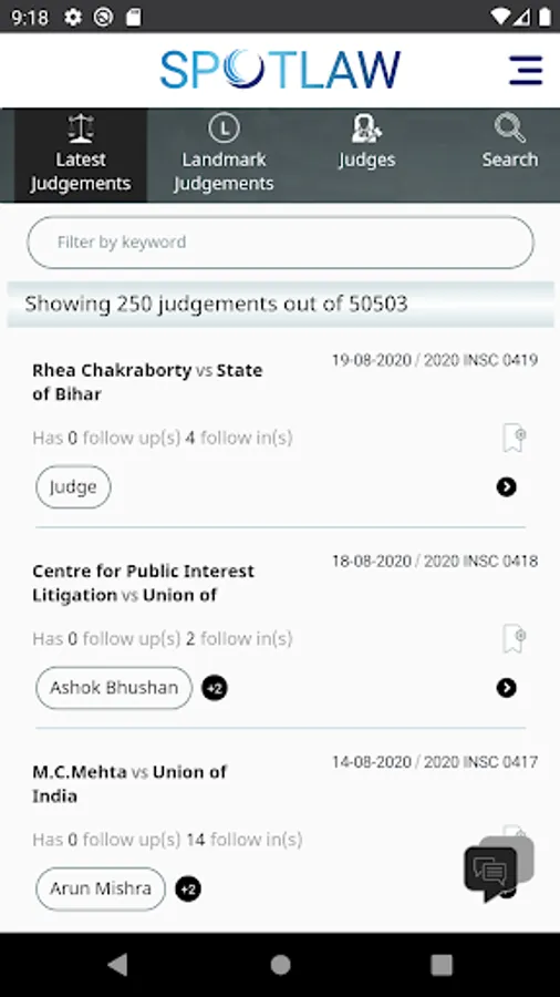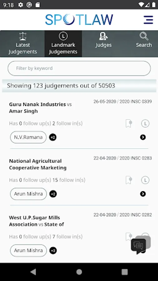 SpotLaw App is the 'go to' app for judgement retrieval of the Apex Court of India. Powered with easy navigation & user friendly interface you can create your own, one or more, library of judgements by bookmarking, perform search based on Appellant, Respondent, Citation or browse based on Subject or Statute. Word search capability helps search for judgements that includes a word or phrases.