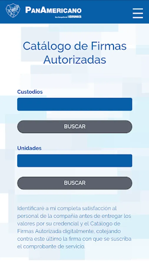 El Catálogo de Firmas sirve para buscar y cotejar que el personal y unidades de traslado de PanAmericano que se presenten a su empresa estén debidamente autorizados para realizar los servicios.