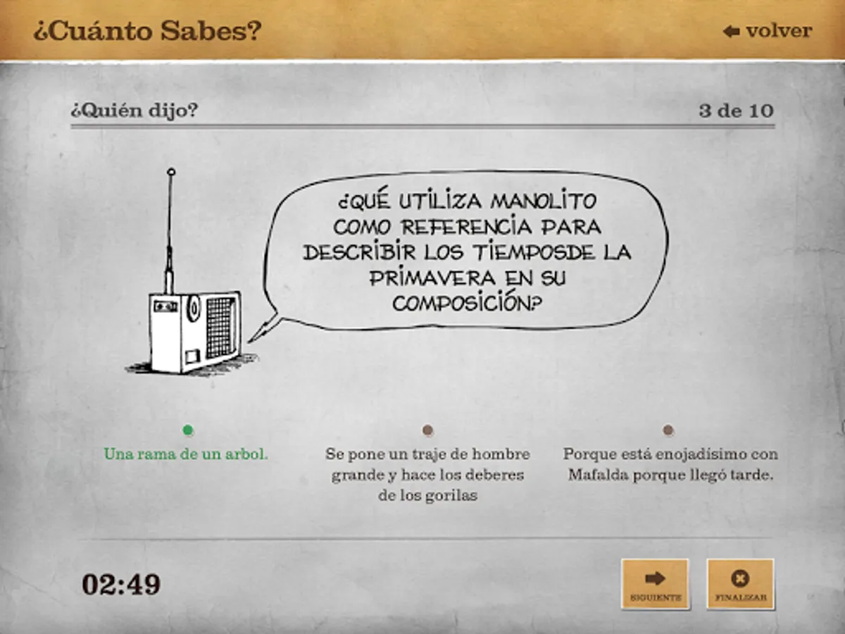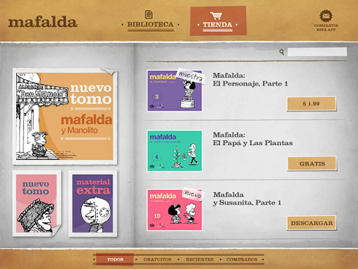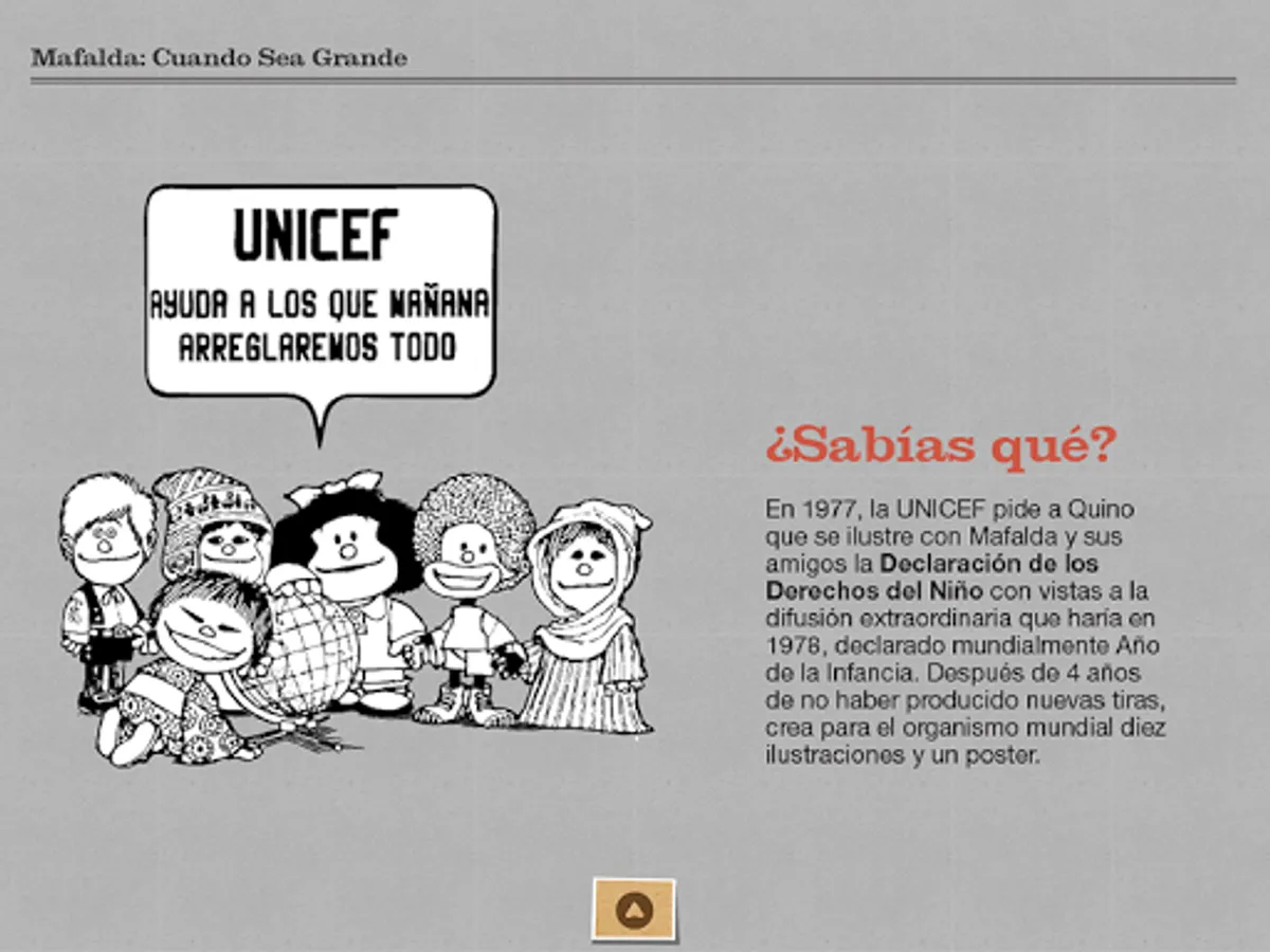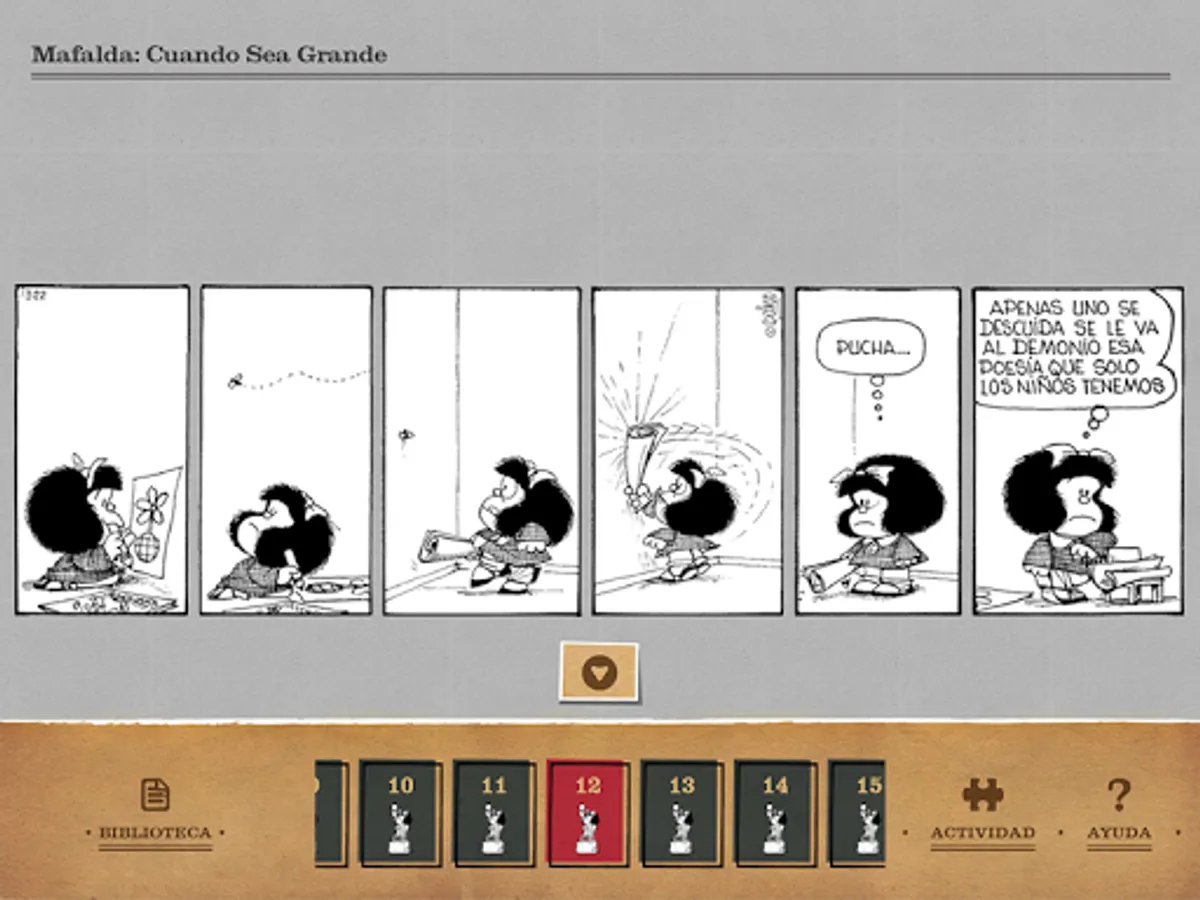 This application comes with interactive books of approximately 30 strips each organized in different themes such as "Mafalda and soup", "Mafalda and parties", "Mafalda when I grow up" and many more. In total, there will be around 64 volumes.