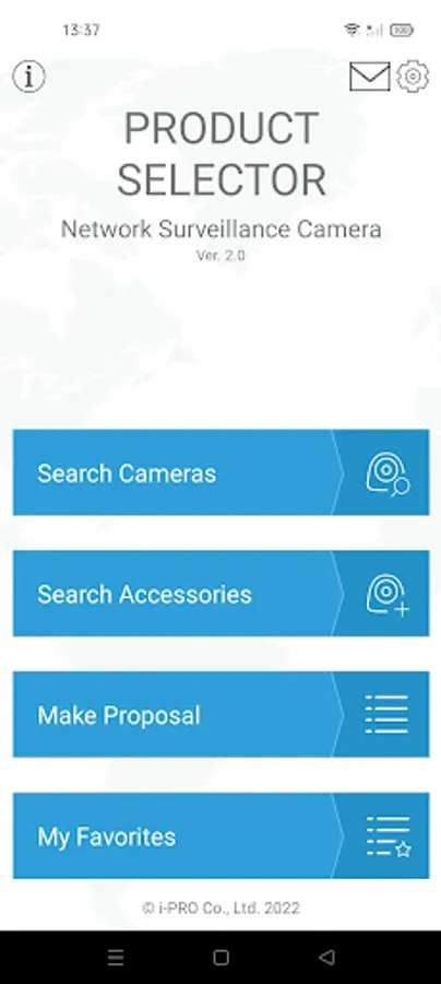 i-PRO Product Selector is narrow down the i-PRO cameras and accessories, check the product specifications, and check the list of products that can be installed. It is also a smartphone application that allows anyone to easily create proposals for network cameras.