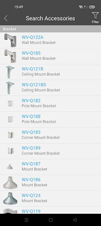Check the list of cameras narrowed down by the filter, and display the data sheet and spec comparison of the selected camera. The display results can be sent to a PC by e-mail, etc. You can check the list of accessories that can be attached to the selected camera.