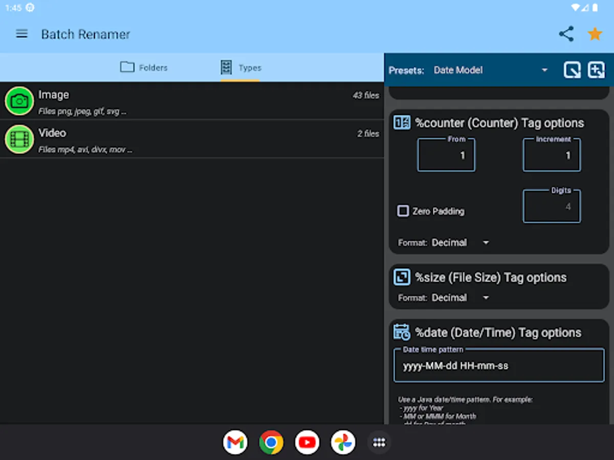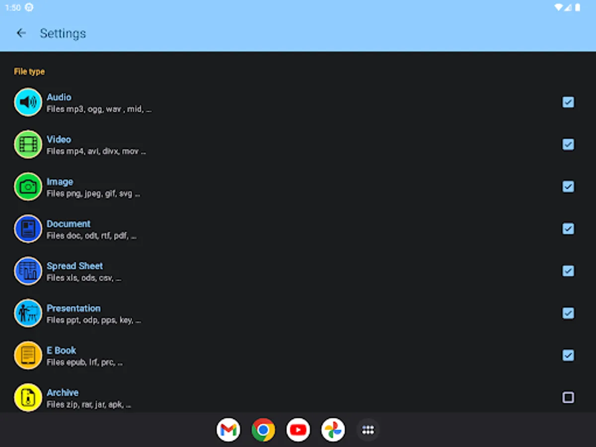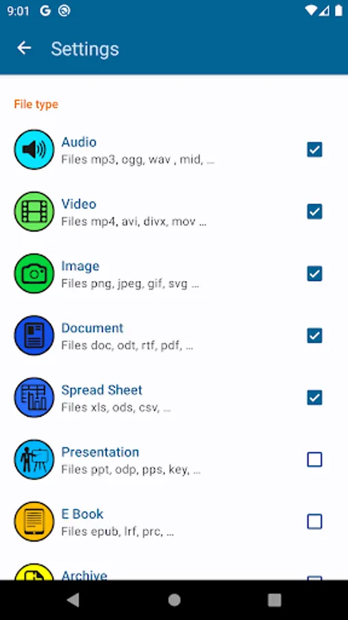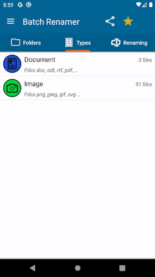 The application allows working with folders or file types (Images, Videos, documents, etc.). File types are configurable.