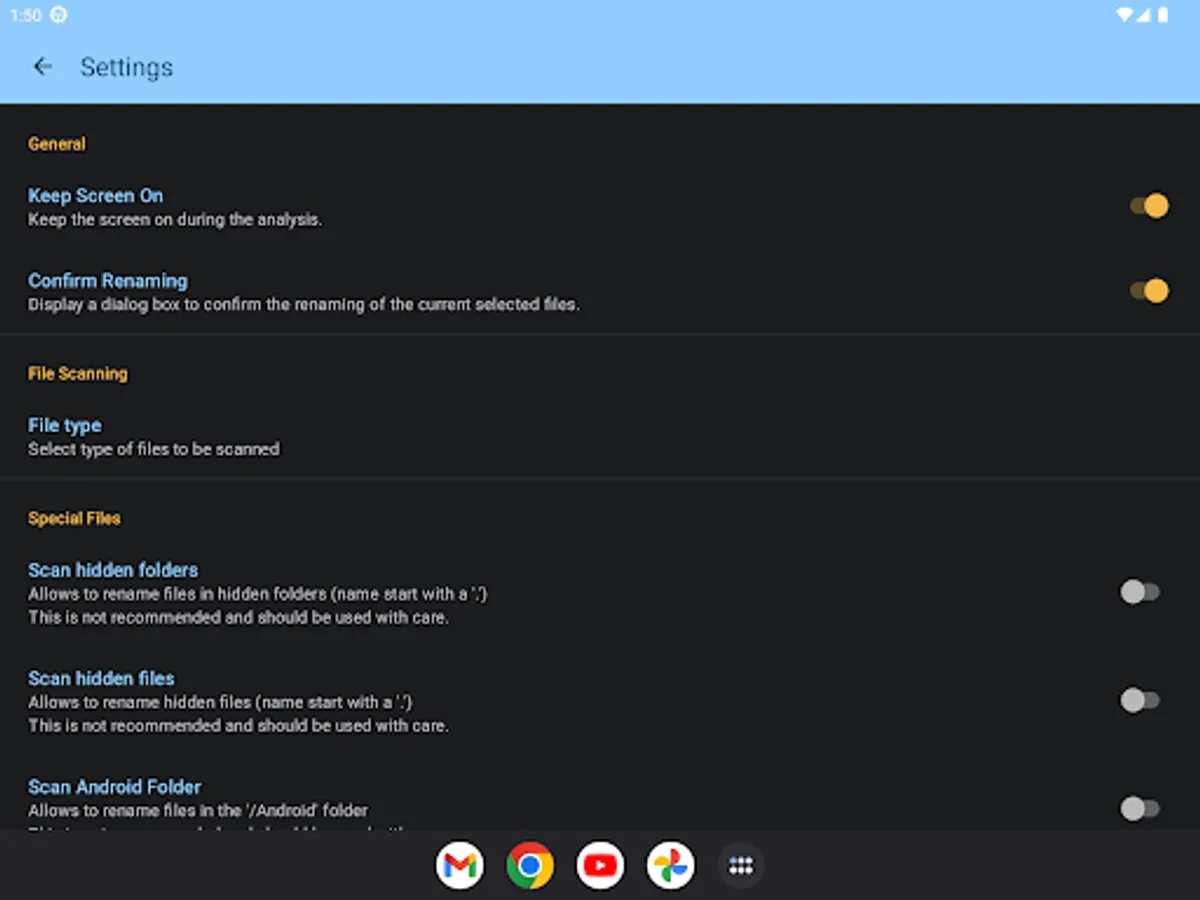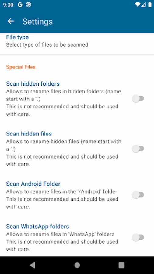 Please note that hidden folders and files, as well as Android and WhatsApp folders, are not scanned by default to avoid creating issues with applications. However, experienced users can, at their own risk, authorize these elements.