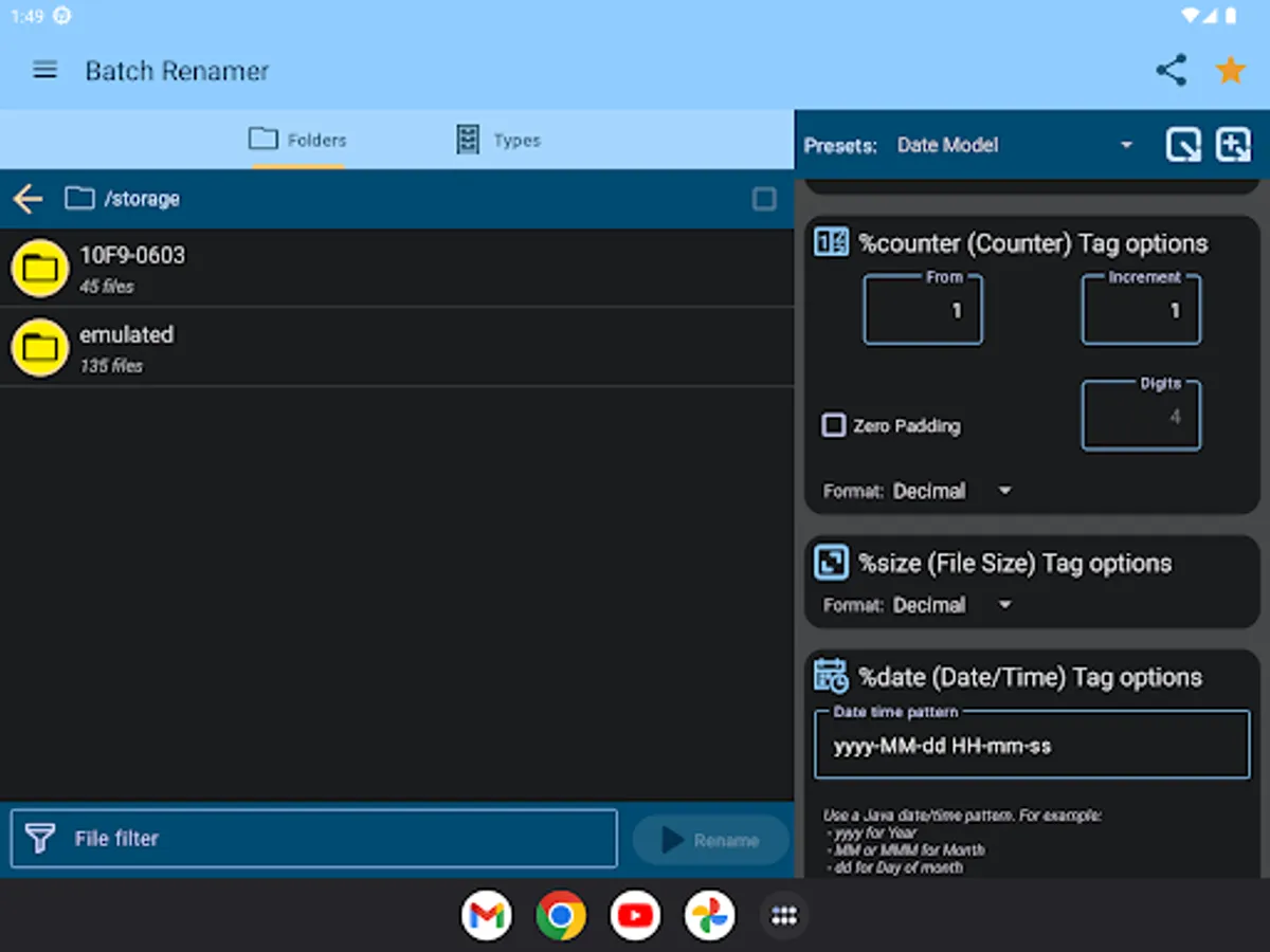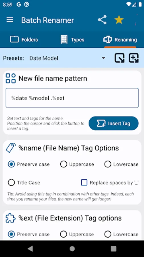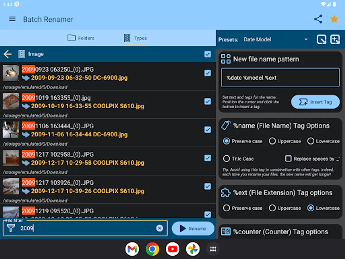 The new name is defined by a pattern containing text and tags that incorporate elements of the file or EXIF data. For example, the pattern "Trip %date %model.%ext" will create a file name like "Trip 2023-10-20 12-05-22 Pixel 7a.jpg".