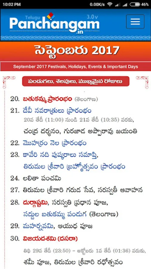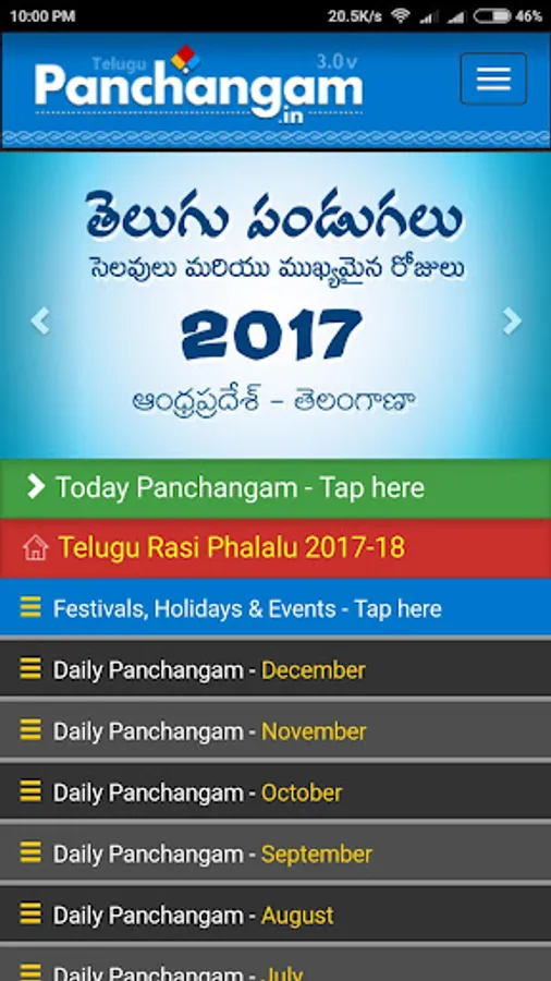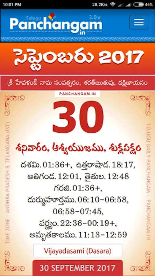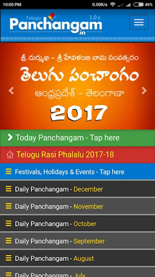 Telugu Calendar 2017 Daily Panchangam Online App with Festivals & Holidays for Andhra Pradesh and Telangana States.