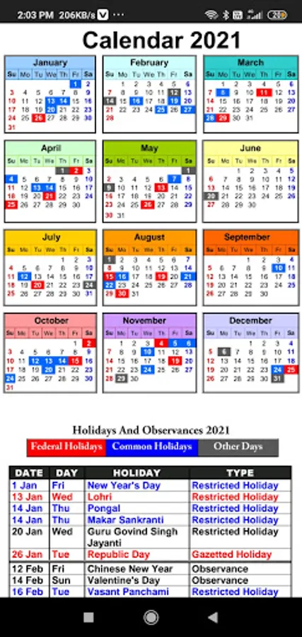 Summary of Useful Features of the Calendar 2021 app: