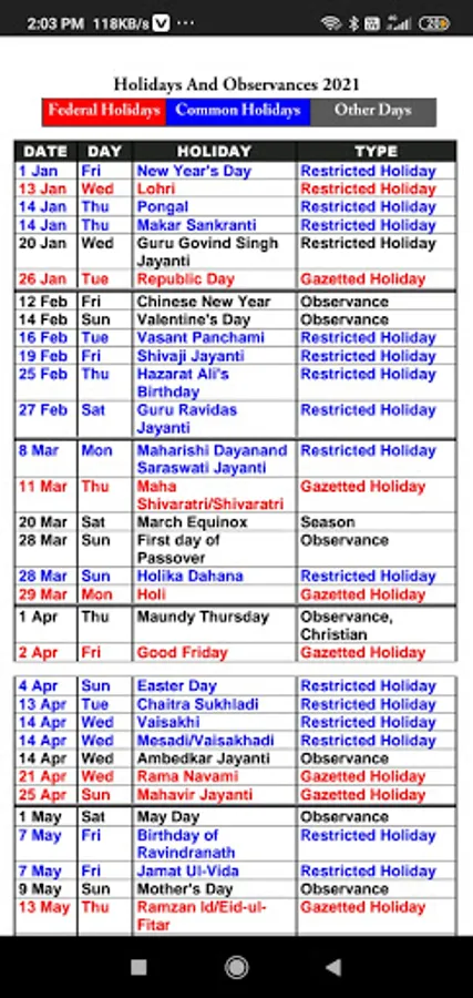 A list of all holidays and festivals are present in this app.