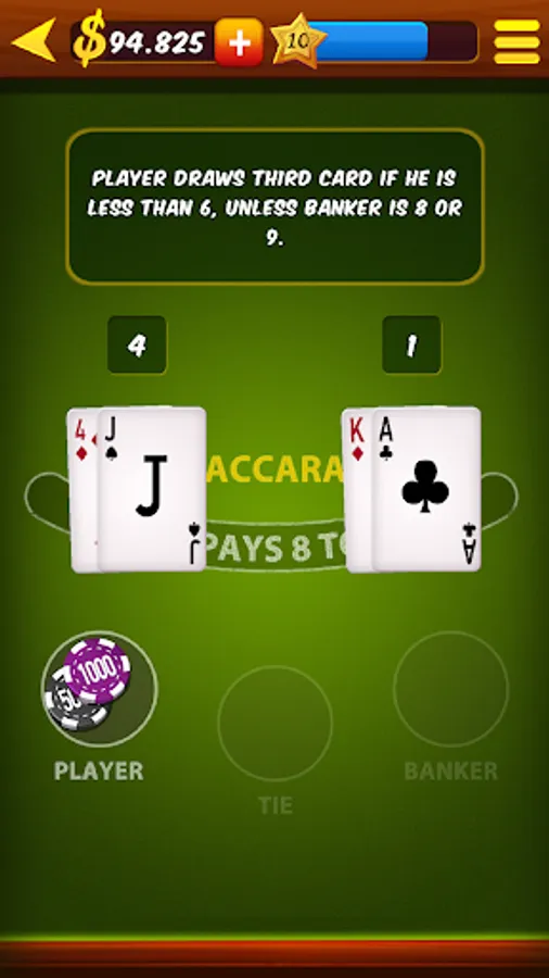 -If the player has total of 5 or less, the player automatically hits and the banker gives the player a third card.