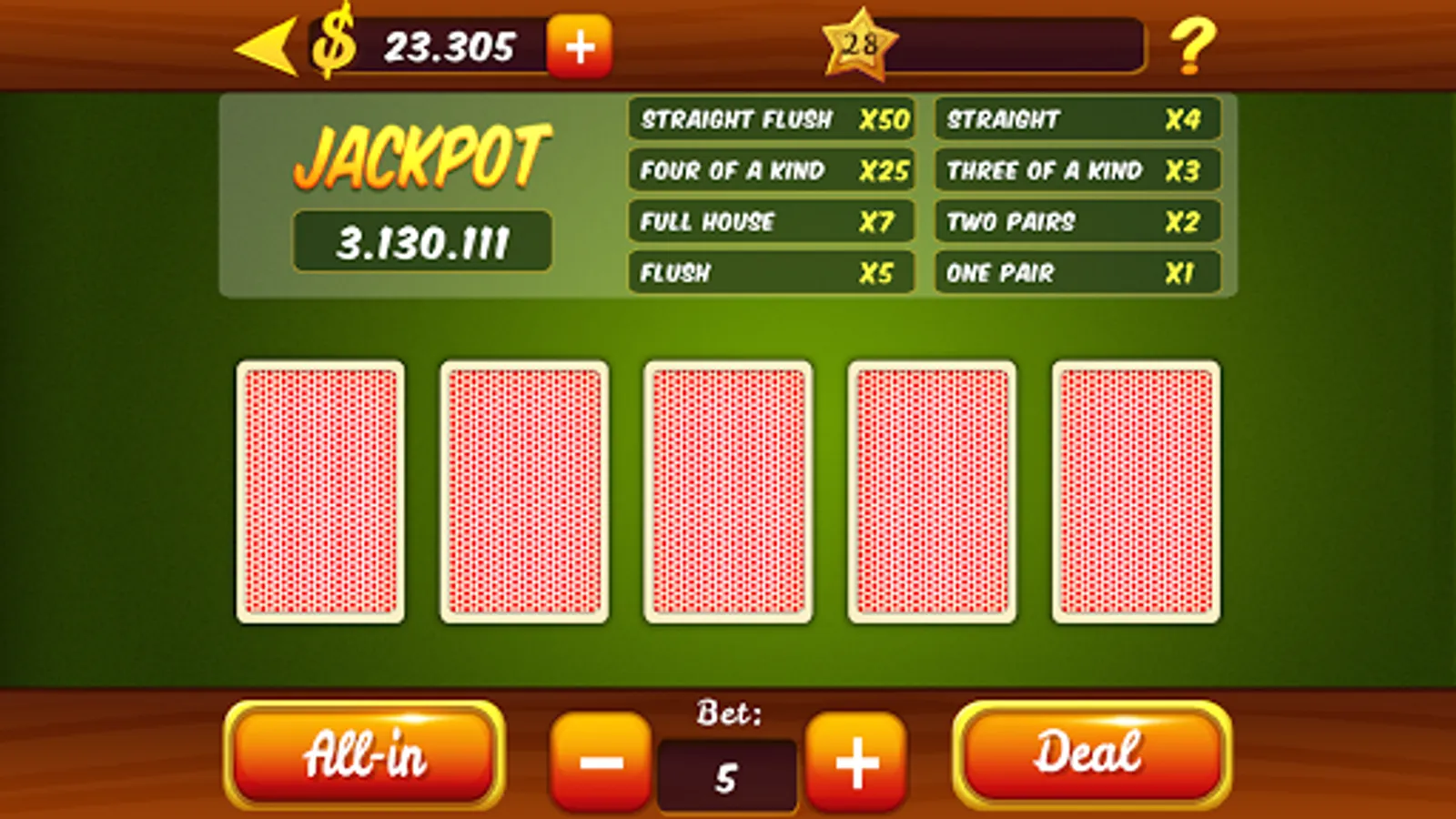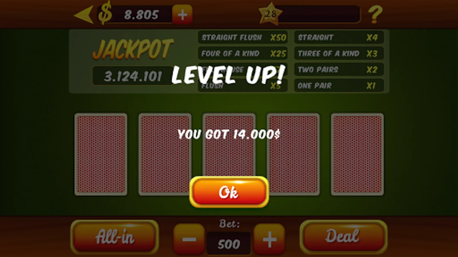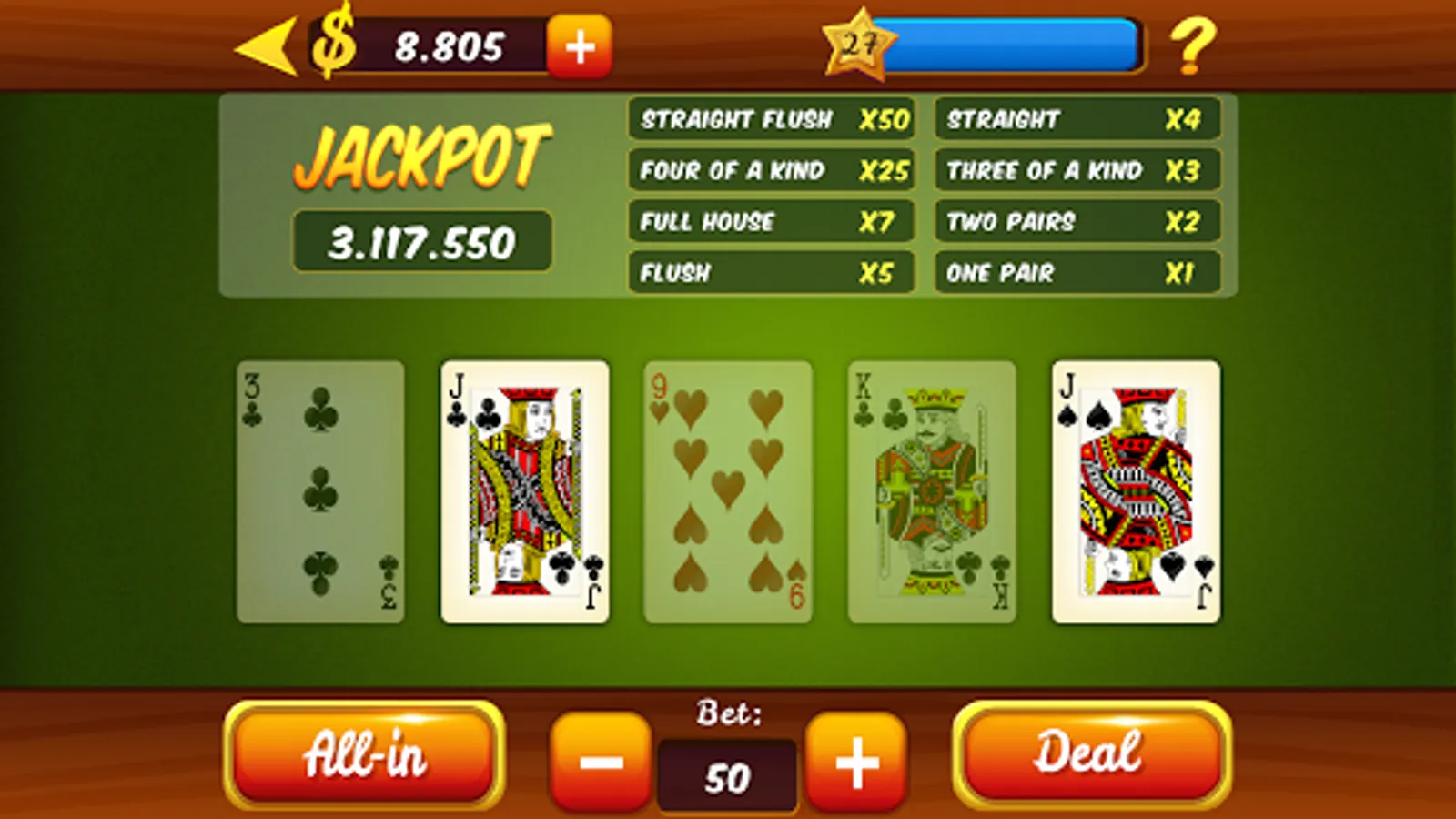 The graphics are in high definition to provide the best video poker experience possible! Video Poker Jacks or Better HD is very easy to learn, but hard to master. In this new adaption of video poker jacks or better we have also incorporated a level-system. You get experience points for every deal you play based on your bet. As you gain experience points, not only will you reach a higher level, but you will also get a high reward!