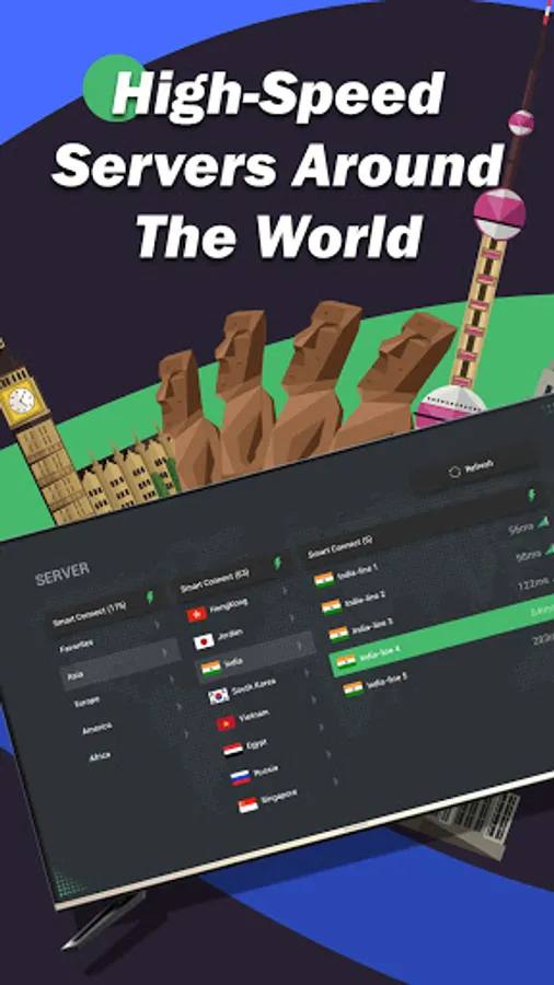 One tap to connect. Panda will recommend the best servers to you according to your location. And you can connect to any servers you want. Currently, Panda provides a large number of servers in America, Asia as well as Europe, and the number is growing.
