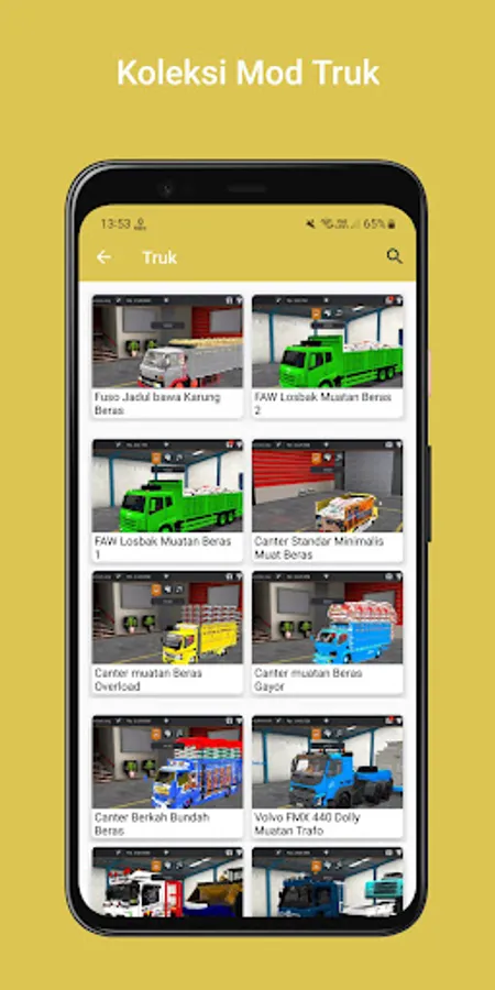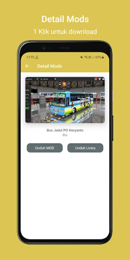In this application, we have provided hundreds of MODs and BUSSID Liveries with various types such as Buses (HD, MHD, SHD, HDD, UHD, DD, XHD, Jetbus, JB3+, Vintage, Avante, Commuter, Zeppelin, Evolander), Trucks (Canter, Fuso, Hino, Volvo), Cars (Lamborghini, Toyota, Honda, Sports), Telolet Basuri, Mod Bussid Maps, and much more that we will continue to add for you to download directly without any hassle.