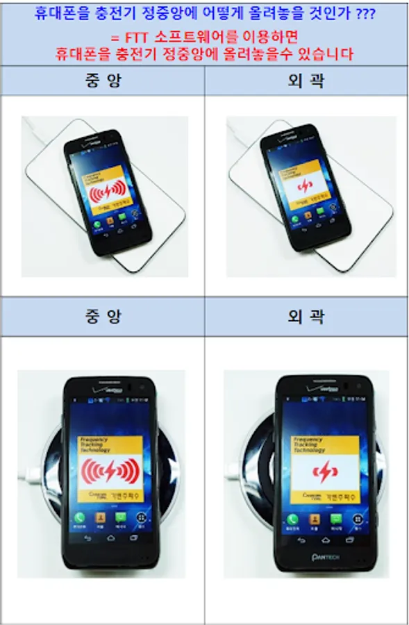 이 기술을 사용하면 무선 충전을 하기 위해 휴대폰을 충전 패드위에 올려 놓을 때, 최적의 위치 (가장 충전효율이 높은 위치)에 휴대폰을 정치시킬수 있으며 만약, 사용자가 그 위치에 정치하지 않으면, 휴대폰이 정치된 위치에서 휴대폰 스스로가 가장 적절한 용량의 충전 전류로 하향 조정하여 충전을 개시함에 따라서 휴대폰의 발열을 자연스럽게 예방할 수 있게 되었습니다.