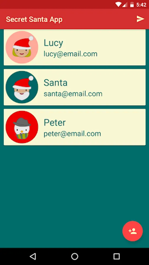 - Once every participant has been added, press the send button and automatically the app is going to assign the Secret Santa to everyone and send the email to all user.