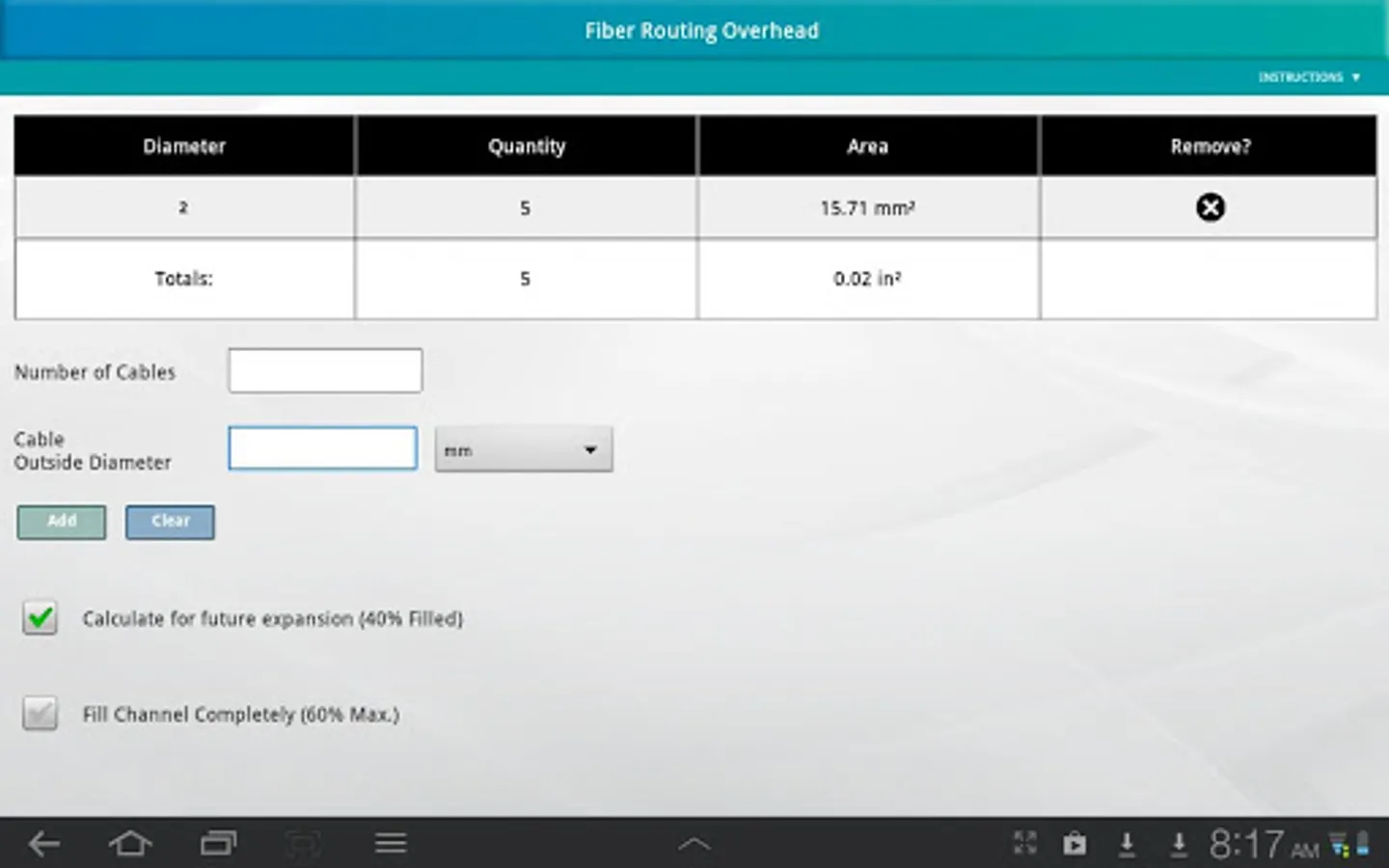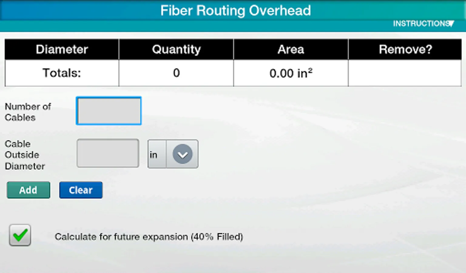 · Cabling Fill Capacity Calculator: Pathways - Calculate overhead data cable channel capacity requirements for existing applications (40% fill) and future expansion (60% fill)