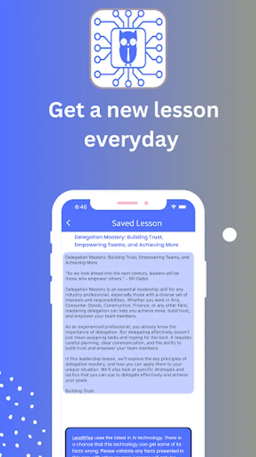 The AI-generated lessons will cover a range of topics, such as communication, decision-making, team building, adaptability, and strategic thinking, all tailored to the individual's job title, tenure, and industry. The system will provide practical recommendations, actionable tips, and real-life examples to support the individual's growth as a leader.
