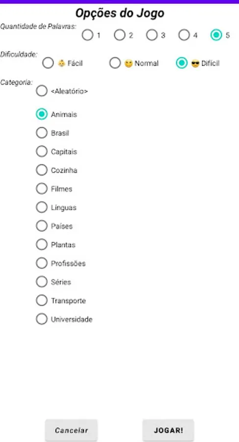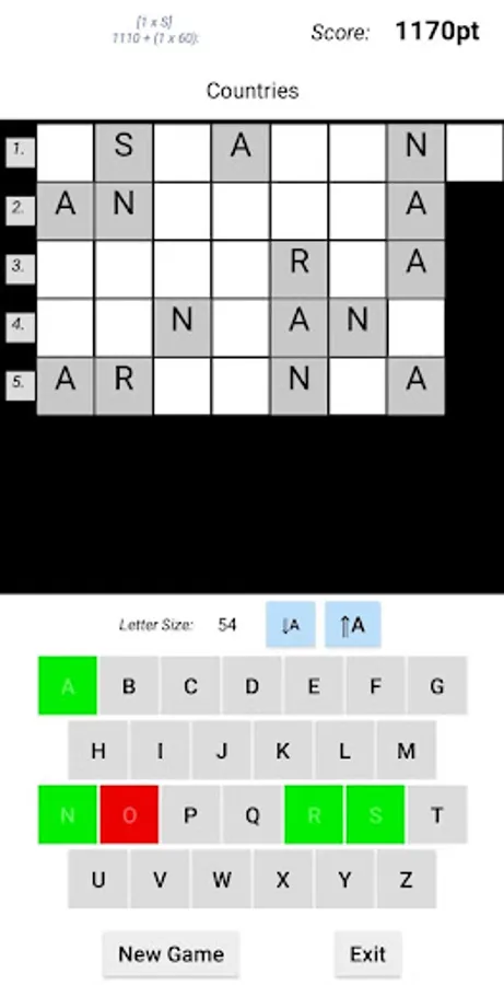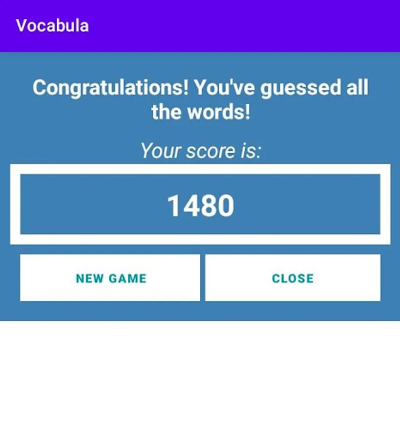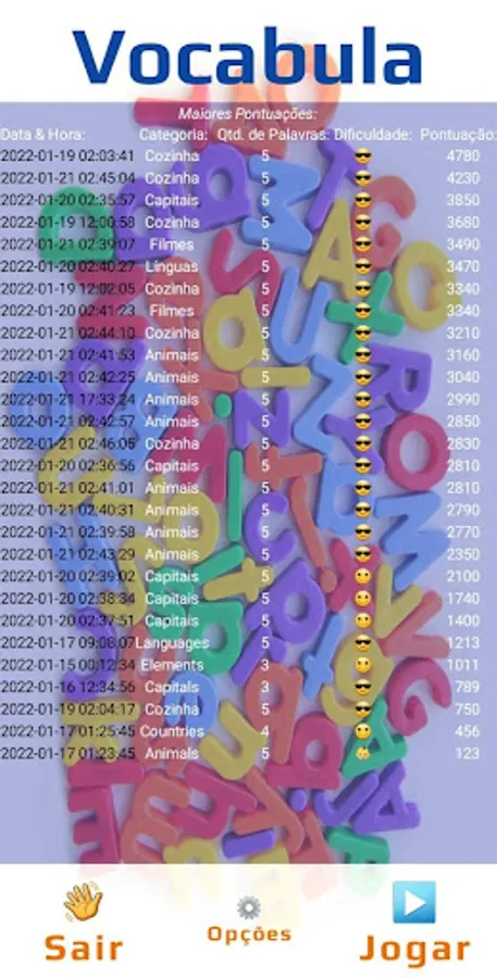 Vocabula is a simple word game, where you can try to guess up to five words at a time, from specific categories, such as: countries, animals, plants, kitchen &c.