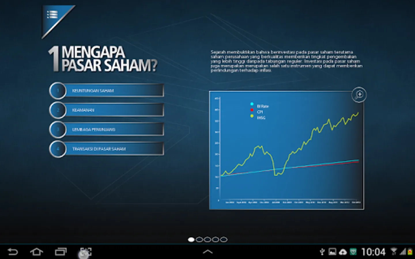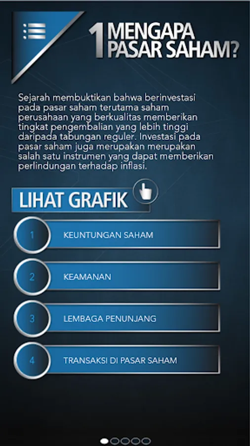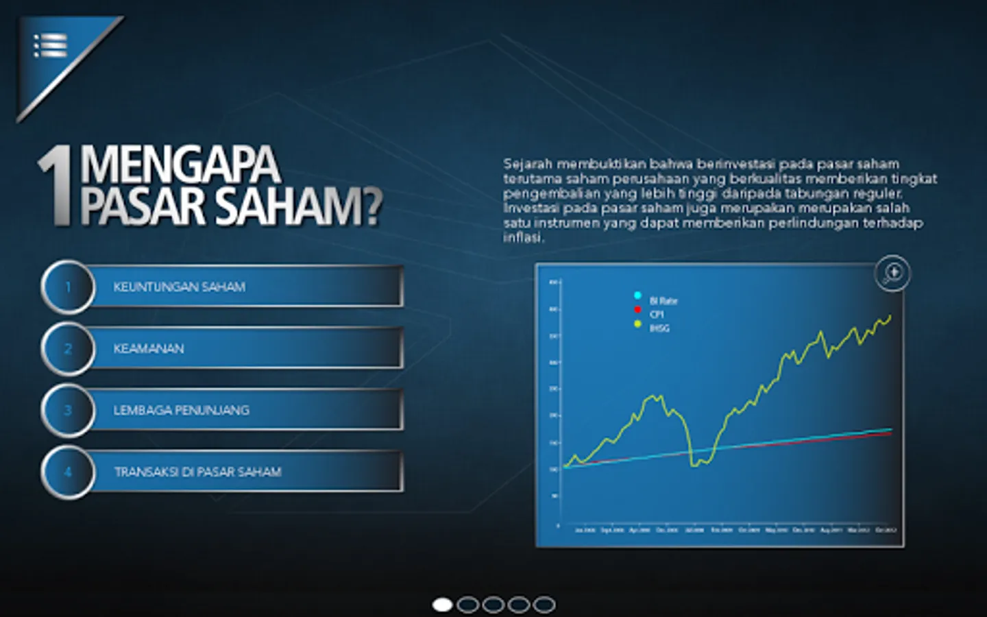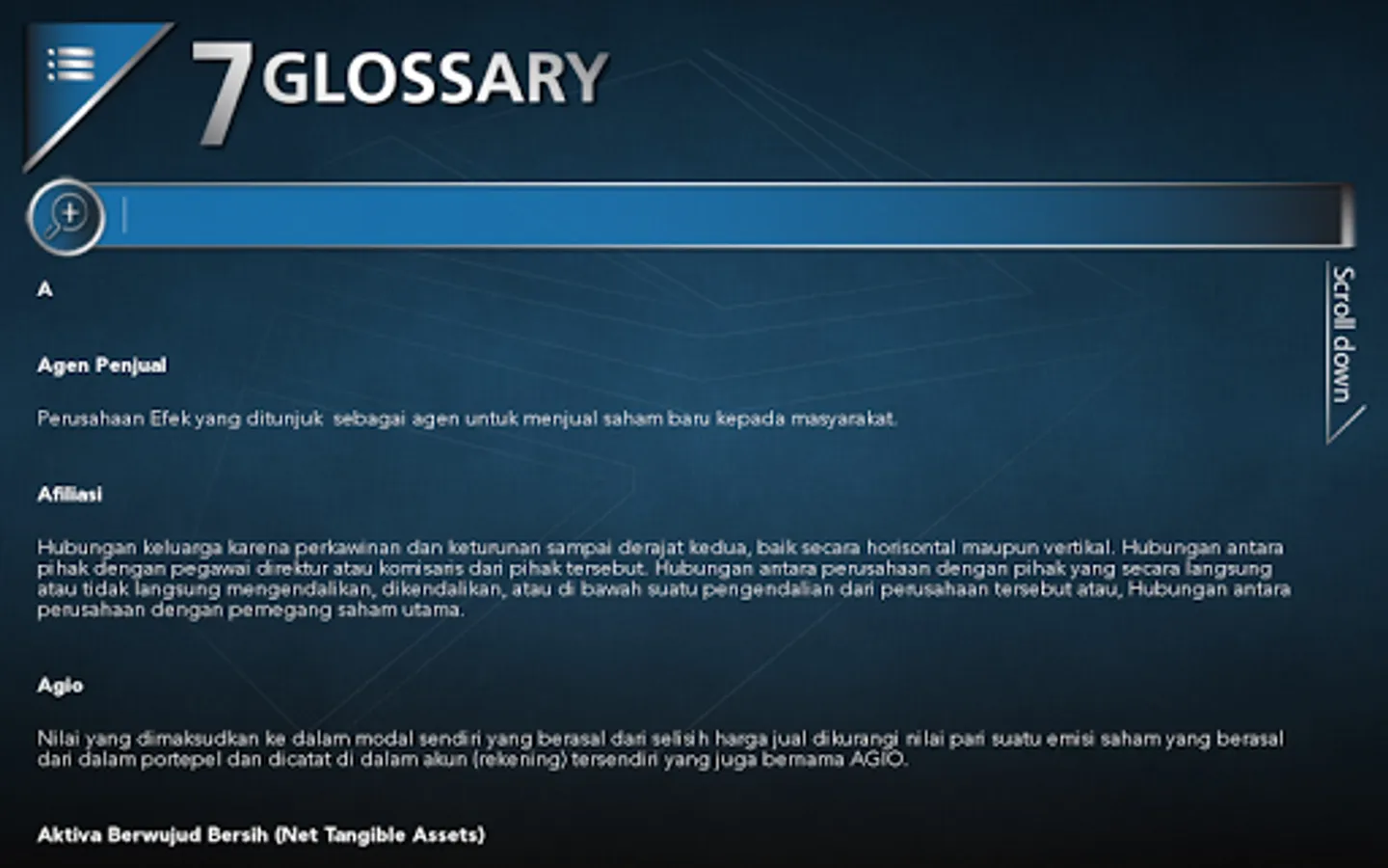 This app provides the fundamental and introduction in how to invest in The Indonesian Stock Market. With simplified language and animation to further explain the mechanism of Stock Trading in Indonesia.